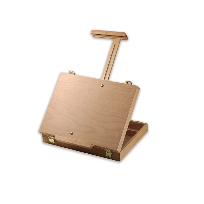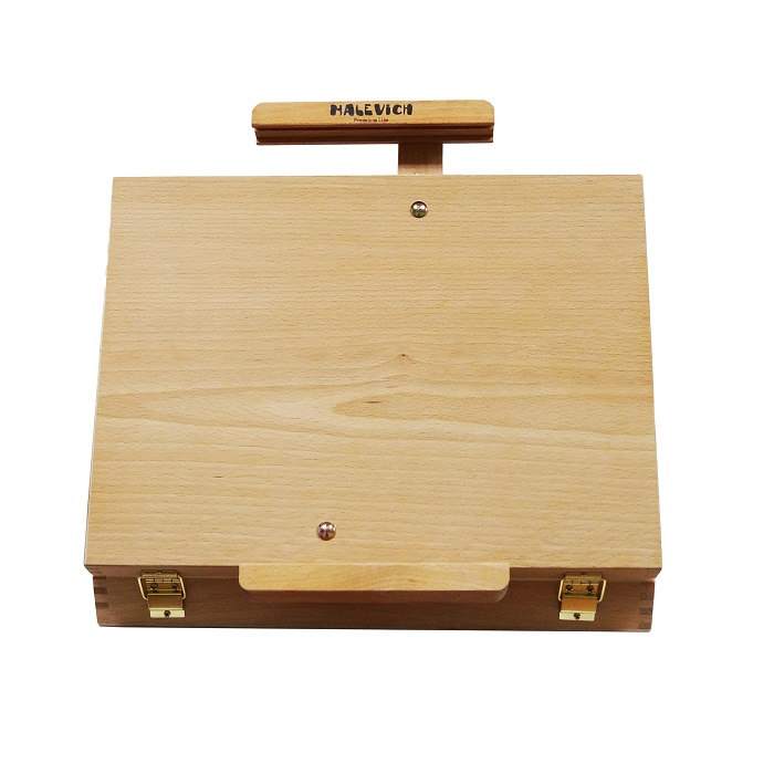 Удобный настольный этюдник сочетает в себе функции мольберта и ящика для хранения кистей и красок. За счет того, что регулируется как верхний бегунок, так и нижняя планка, этот этюдник легко удерживает холсты больших размеров. Выполнен из бука, покрыт лаком.