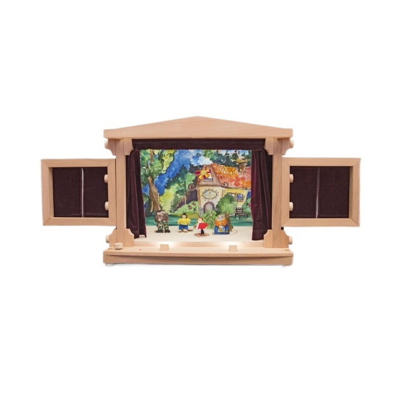 Это миниатюрная модель настоящего театра: механизм открывает и закрывает занавес, сцена вращается, освещениеможно регулировать. По бокам сцены - два подвижных крыла, экраны для рук “актеров”. Нарисуйте свои декорации, своих героев и пусть шоу начнется!