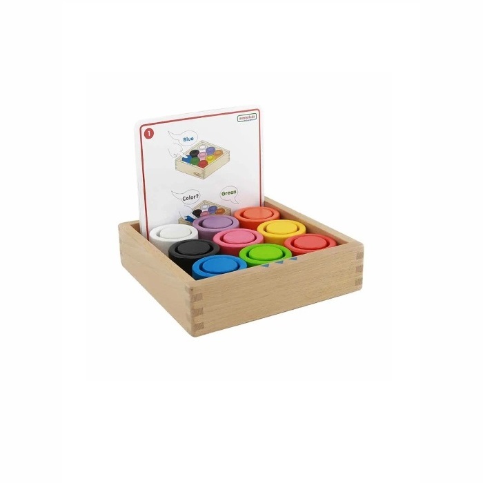 Набор состоит из 9 пар деревянных круглых блоков и чашек в 9 разных цветах. Цвет подписан на английском языке. Блоки вмещаются в чашки. Набор поставляется в прочном деревянном ящике размером: 20,5 х 20 х 5 см. К набору прилагаются карточки с заданиями.