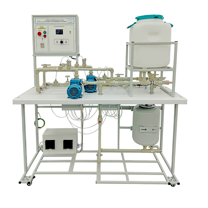 В системе располагается технологический бак, позволяющий производить лабораторные работы не подключая стенд к сети водоснабжения и канализации лаборатории. В системе располагаются два центробежных насоса. Система трубопроводов и задвижек позволяет подключать из как последовательно, так и параллельно.