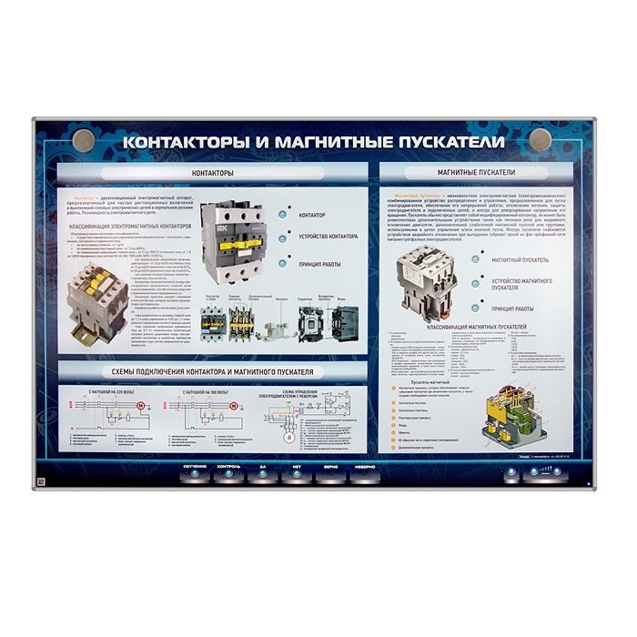 Электрифицированный стенд "Контакторы и магнитные пускатели" представляет собой полноцветную светодинамическую панель, на которой отображена информация о назначении и функциях контакторов и магнитных пускателей. Представлены схемы включения, принципы работы, классификация.