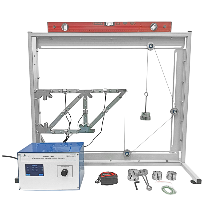 Учебная лабораторная установка позволяет определять распределение усилий в плоских фермах при различных вариантах нагружения и различных конфигурациях ферм. Стенд может быть использован при проведении лабораторных работ по курсу «Техническая механика».