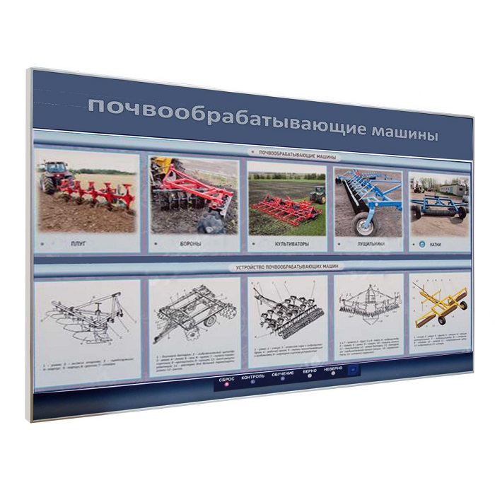 Стенд-планшет представляет собой каркасную информационную панель с раздельной световой индикацией, на лицевой панели которой нанесены основные виды почвообрабатывающих машин, информация об устройстве почвообрабатывающих машин и основных конструктивных элементах.